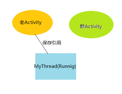 这段代码很平常也很简单,是我们经常使用的形式。我们思考一个问题:假设MyThread的run函数是一个很费时的操作,当我们开启该线程后,将设备的横屏变为了竖屏,一般情况下当屏幕转换时会重新创建Activity,按照我们的想法,老的Activity应该会被销毁才对,然而事实上并非如此。