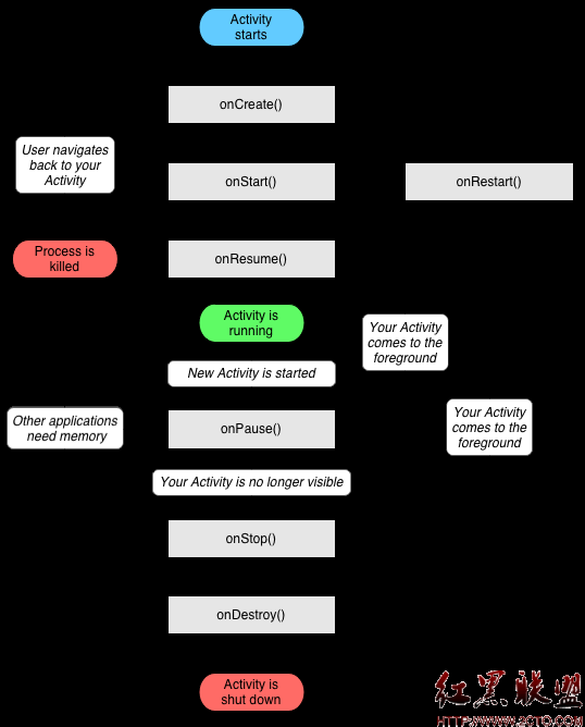 3.当它完全被另一个Activity覆盖时则处于停止状态。它仍然保留所有的状态和成员信息。然而对用户是不可见的,所以它的窗口将被隐藏,如果其它地方需要内存,则系统经常会杀死这个Activity。 当Activity从一种状态转变到另一种状态时,会调用以下保护方法来通知这种变化: void onCreate(Bundle savedInstanceState) void onStart() void onRestart() void onResume() void onPause() void onStop() void onDestroy()