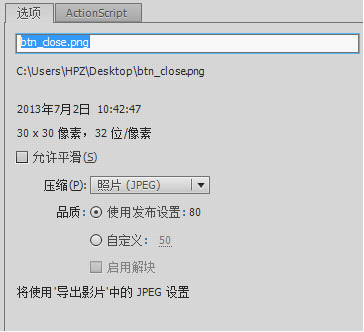 在库中点击图片右键属性,设置图片压缩,选择jpeg格式,建议品质设置为80,避免图片失真太过严重,处理完毕后就可以发布为swf或swc,然后添加到项目中